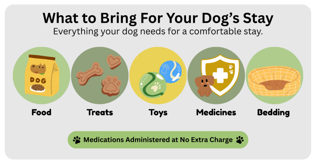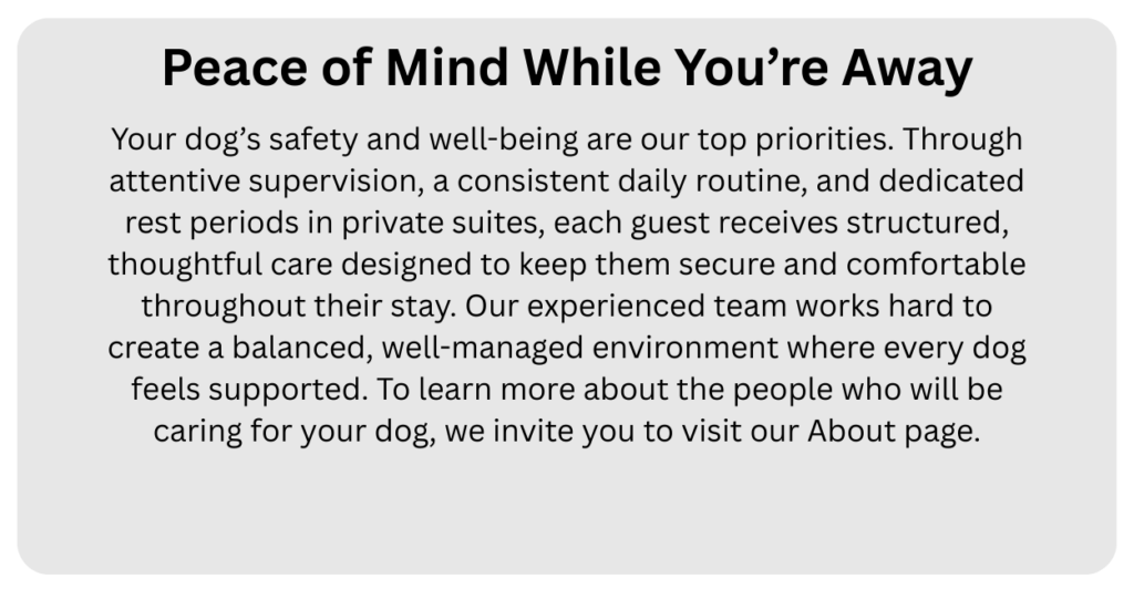 All boarding guests participate in supervised play throughout the day, with ample opportunities for running, wrestling, socializing, and napping. We welcome dogs of all sizes, ages, and breeds, and each guest re-energizes in a private suite for naps and bedtime. After hours of activity and interaction, your pup will be well-socialized, well-exercised, and ready for a peaceful night’s rest.
